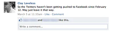 These two guys are not huge in my life — one is a former co-worker, the other is a high school friend of my brother’s. Best that could be said is that they’re friendly acquaintances, whom I have no particularly strong feelings about either way. However, my tweets-to-Facebook bridge has been irritating enough to them that they dropped a finger on a “Like” click in favor of me shutting up.
